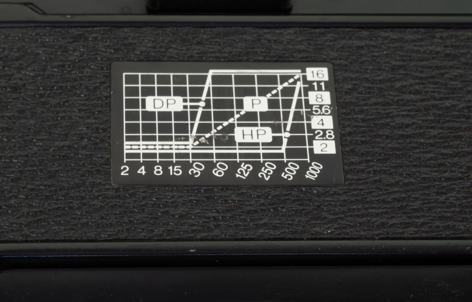 - the 3 programs were not designated by a symbol corresponding to the intended use (normal, sports, landscape), but by obscure initials (P, DP, HP) and the possible aperture/shutter speed combinations were only documented on a diagram printed on the back of film loading door.