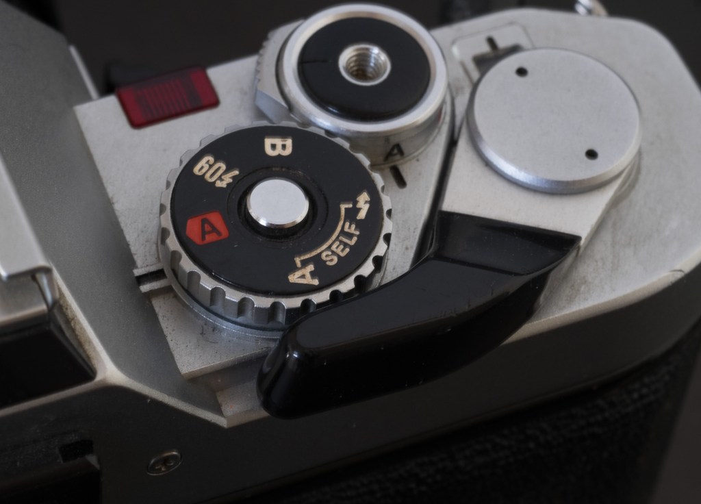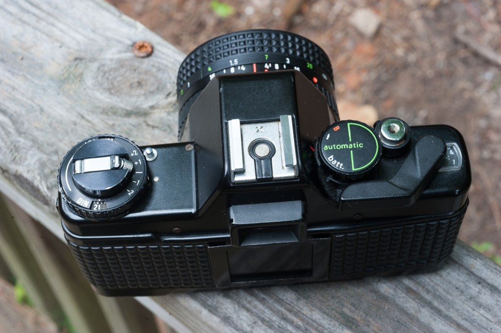 On paper, the B100 is competing in the same category as the Nikon EM or the Canon AL-1 – namely a simplified Aperture Priority automatic exposure and manual focus camera, providing no direct control of the shutter speed to the photographer (no semi-auto or manual exposure modes). The shutter speed selected by the automatic exposure system is indicated by a needle in the viewfinder, but there is no auto exposure lock or even a simple exposure compensation mechanism (like the +2EV push button of many of those simplified Japanese cameras) – the photographer has to use exposure compensation dial (which equates to playing with the film sensitivity). There is no depth of field preview either.