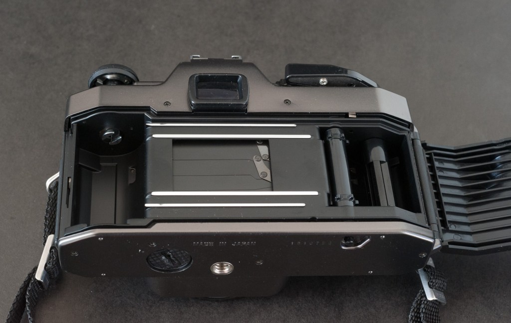 The viewfinder is rather dim, with a short eye relief (roughly similar to the Nikon FM/FE series, which means not that great). I was disappointed not to find a depth of field preview lever, or a shutter release lock: the camera can’t be turned off.