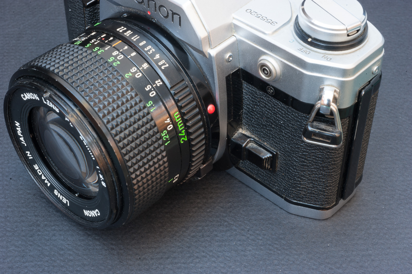 Another reason the demand for the AF-C is pretty low nowadays is that it does not operate without batteries (4×1.5v silver oxide batteries). None of its competitors does – all have electronic shutters – but in the case of the AF-C, even the non-motorized film advance is inoperative in the absence of batteries (the film advance wheel is locked). Which leads people to believe that the camera is dead, when it’s just asking for fresh batteries.