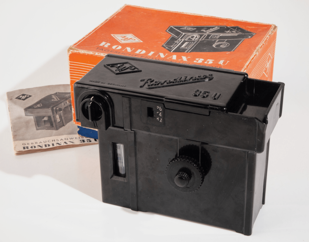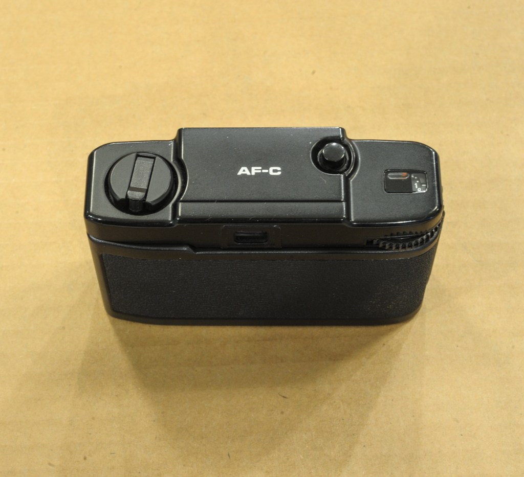 Like its competitors, the AF-C was extremely compact – it integrated a rather fast wide angle lens – a 35mm opening at f/2.8, and was devoid of an electronic flash (it was sold as a separate unit, to be attached to the left of the camera) or from any motorized film advance system. The AF-C’s unique selling proposition was its autofocus – all their competitors relied on zone focus (Minox, Cosina) or on a small rangefinder (Olympus) for focusing.