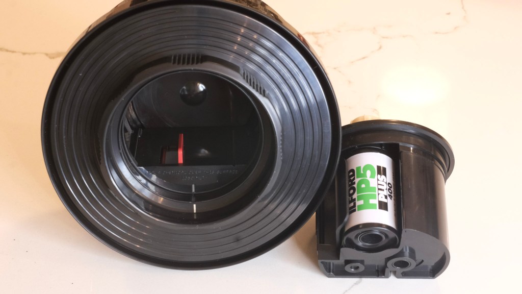 Reliability because to push the film on the reel hidden inside the tank, Lomo relies on a pair of sprockets (that engage in the film perforations) – and will tear those perforations if there is any resistance. If it happens in the middle of the film loading process, you have to turn the red button to cut the film, remove the film receptacle from the tank, develop the film which is already inside the tank, clean and dry the whole thing, then return to your film cartridge, cut the section where the perforations were teared down, resume film loading, and start a new film processing cycle. Of course, you lose a few pictures in the process, and a few hours of your time. Not great.