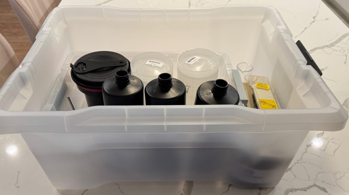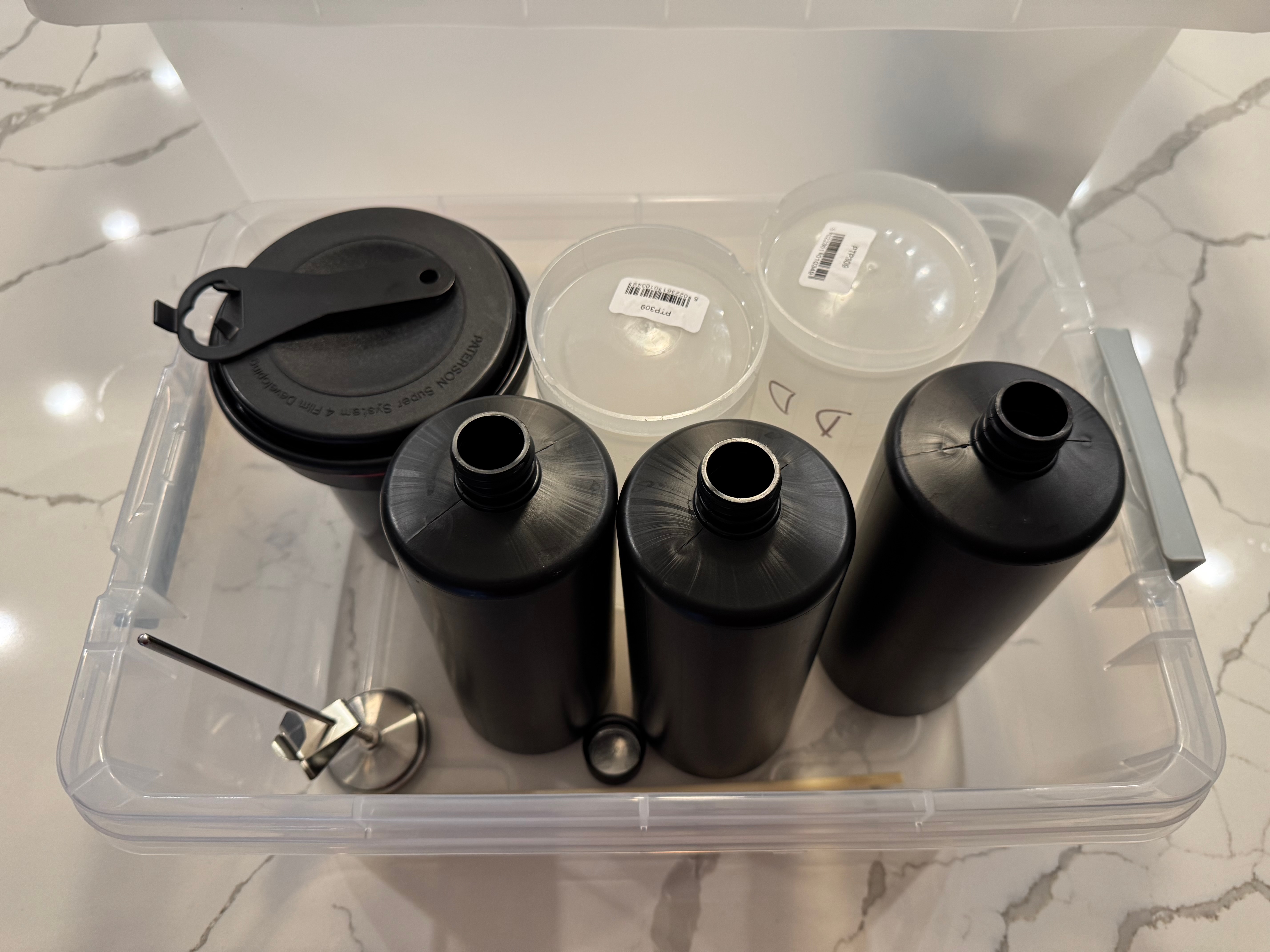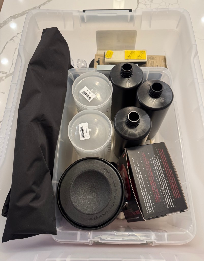 I included in my kit a smaller bin to use as a sous-vide, to keep the chemicals at a controlled temperature while processing the film. It also fits in the larger bin.