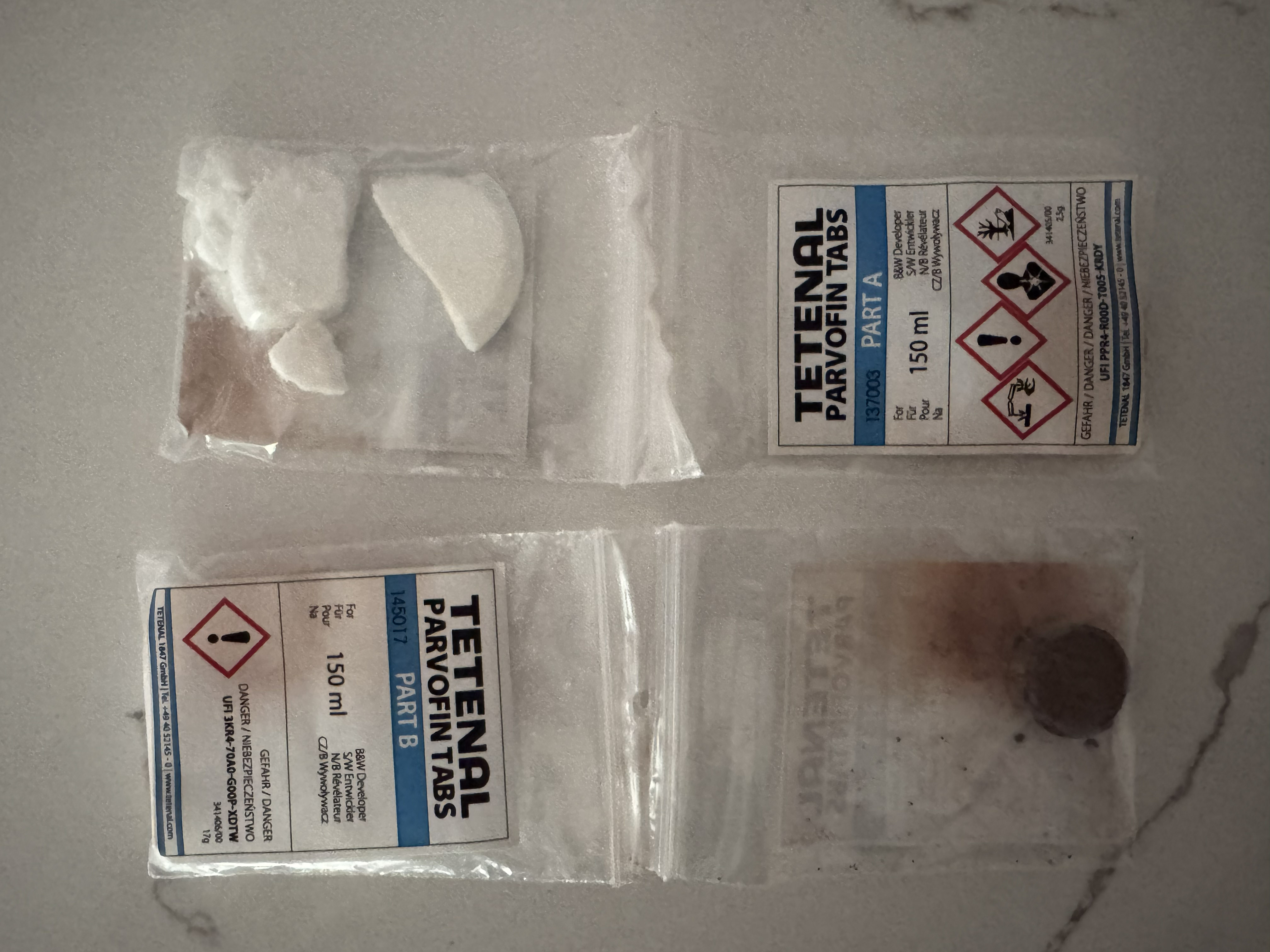 Tetenal: the Parvofin tablets. The developer solution is obtained by placing the two tabs (Part A, Part B) in hot water.