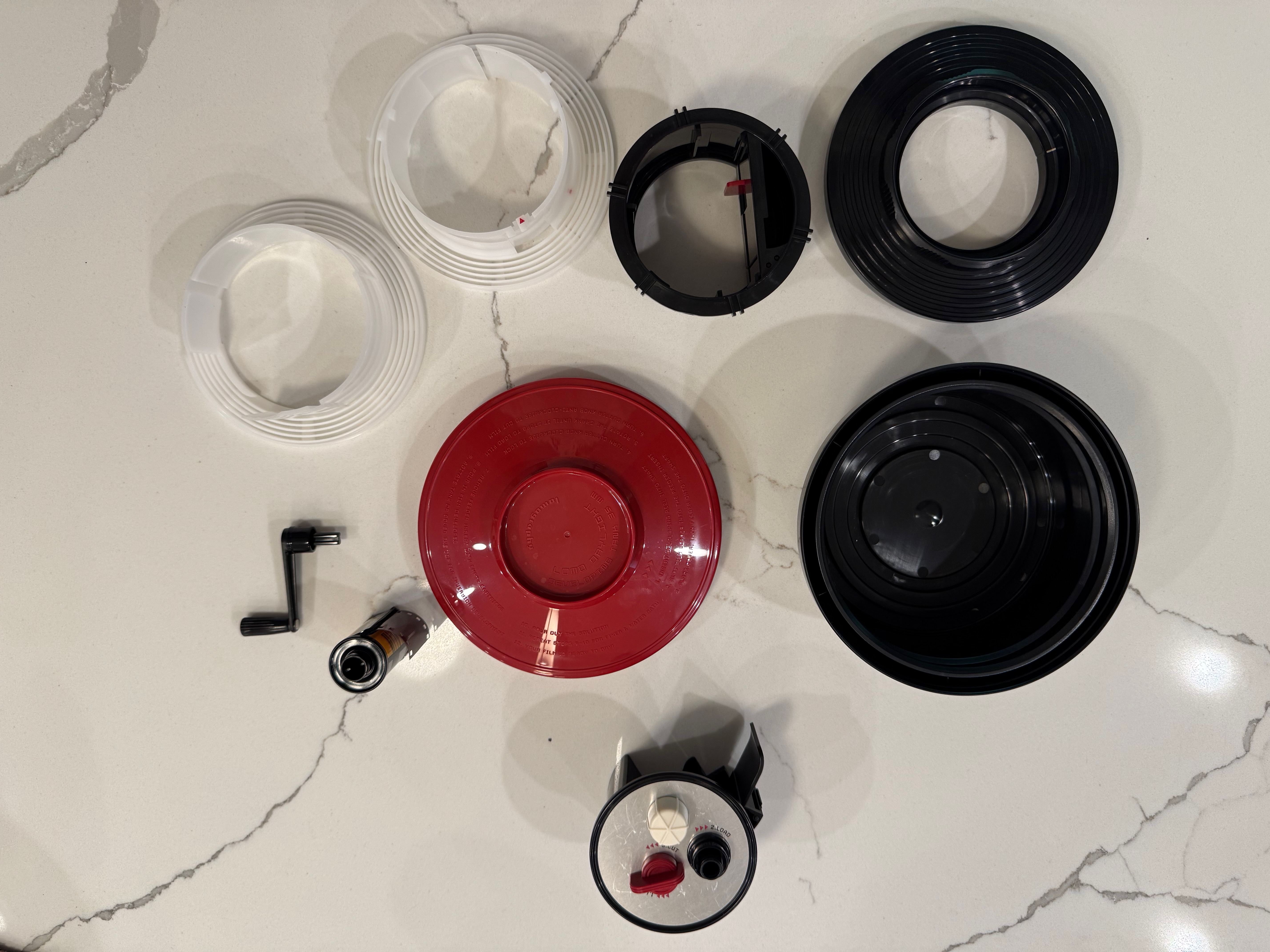 Disassembling the Lomo Daylight – the film loader (bottom of the image) and the crank (of course) don’t need to be cleaned. Reassembly is guided by red arrows and keys.