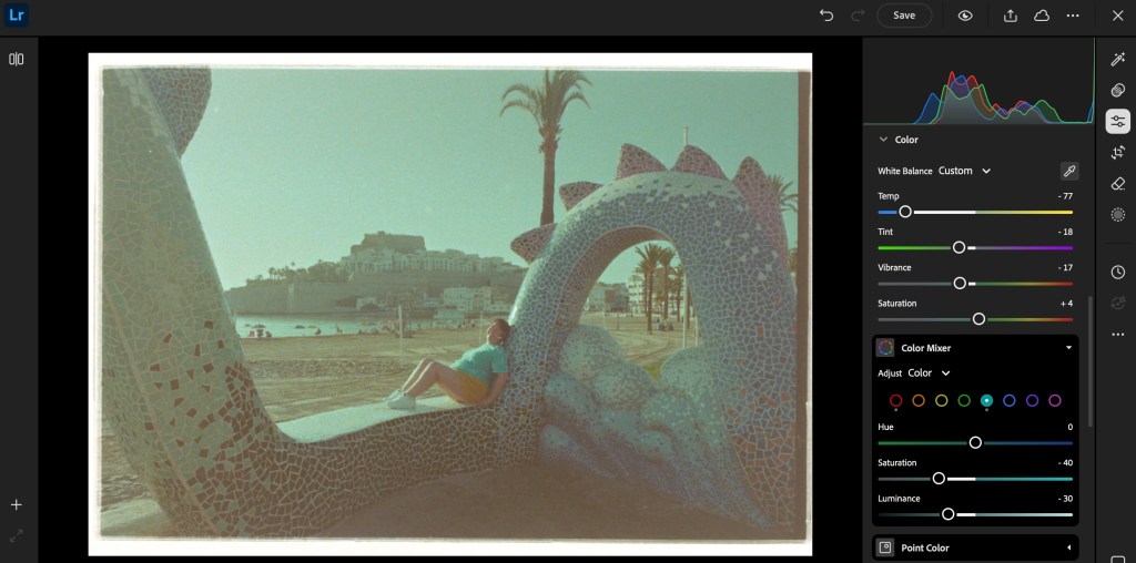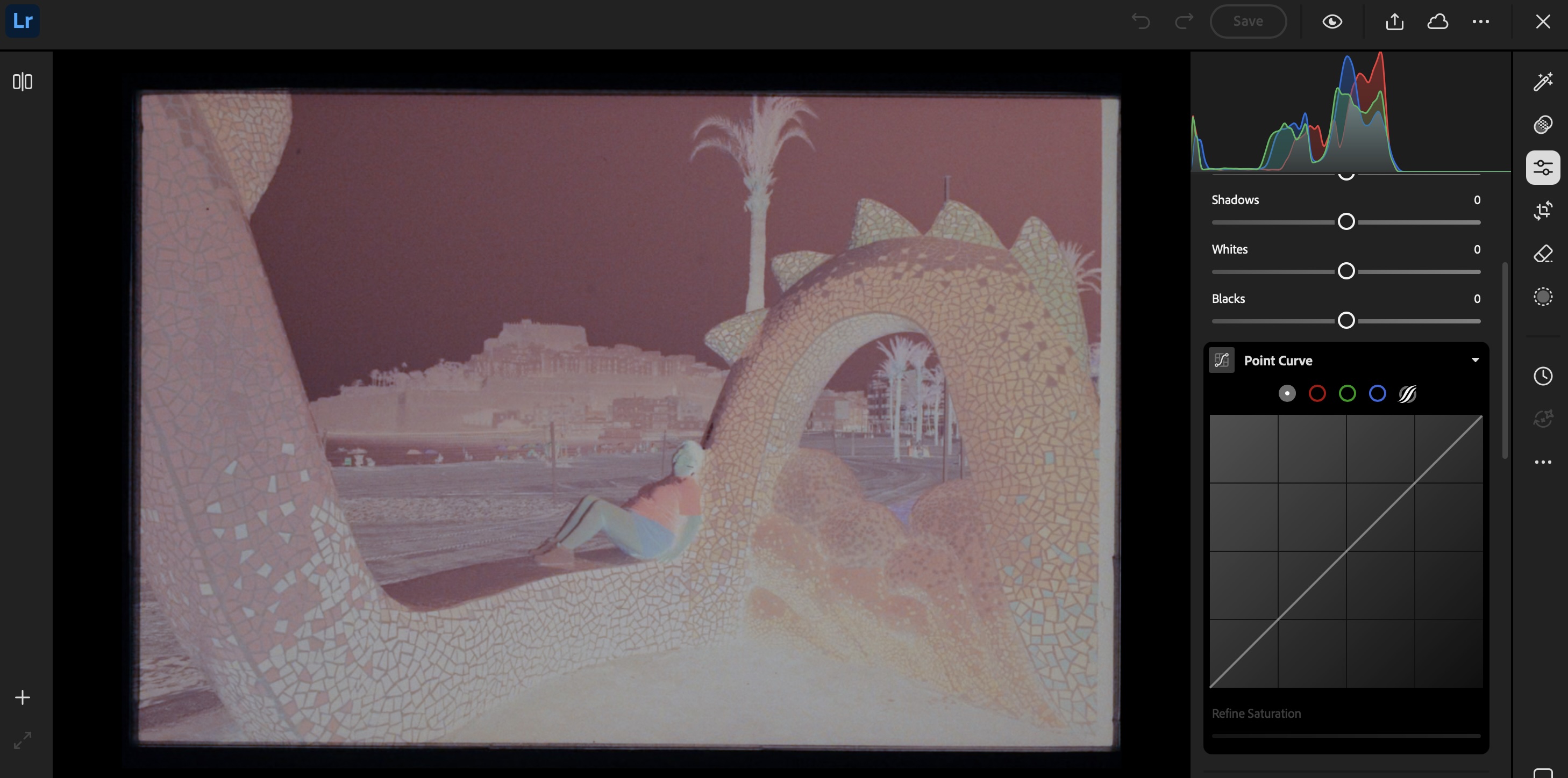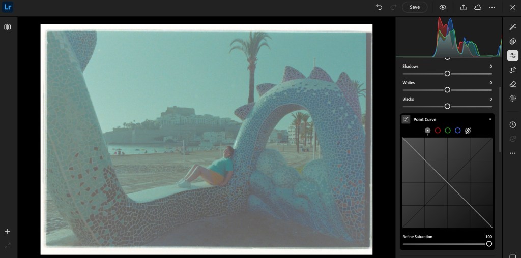 The rest of the process takes place on a “computer” (PC, Mac or iPad). I simply connect a SD card reader to my iPad or to my PC, and upload the images to Lightroom Mobile or Lightroom Web. Even the junior versions of Lightroom will let you invert the negative (by flipping the two ends of the Point Curve), and finalize the image by playing with the exposure, contrast and while balance sliders.