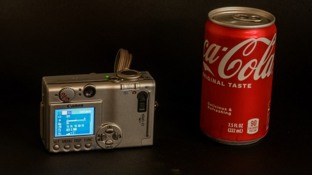 Canon Powershot S400 ready to shoot – the Coca-Cola can is one of the “mini” 7.5 FL OZ cans – the camera is really compact.