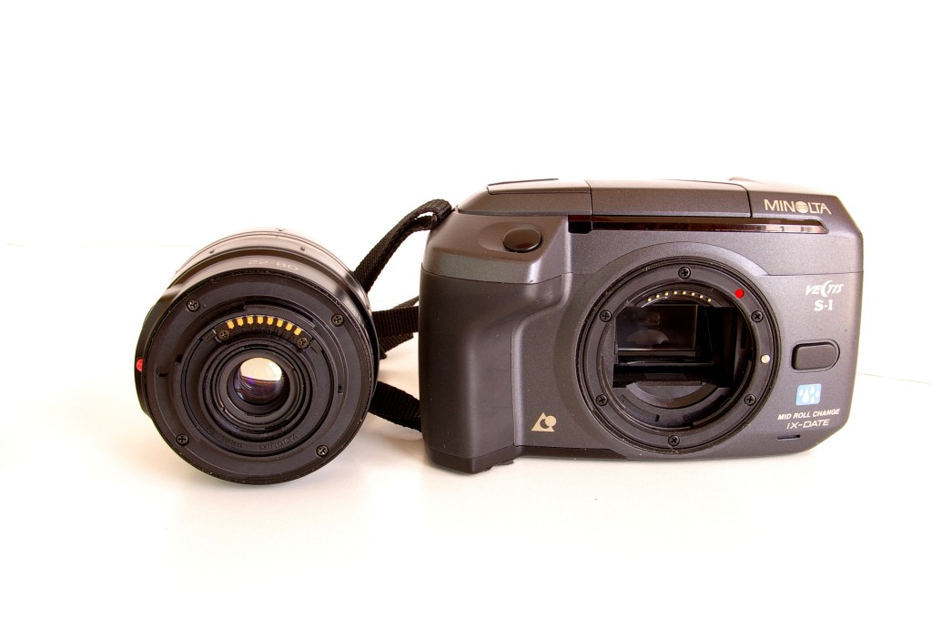 On the contrary, Minolta took the risk of making the Vectis S-1 totally incompatible with its own 35mm lens system – and opted for a shorter focal flange distance (38mm) and for a smaller mount diameter, without any mechanical linkage between the camera body and the lens. The body and the lens could be made much smaller, but Minolta had to develop a whole range of new lenses, and ended up supporting two totally incompatible product lines.