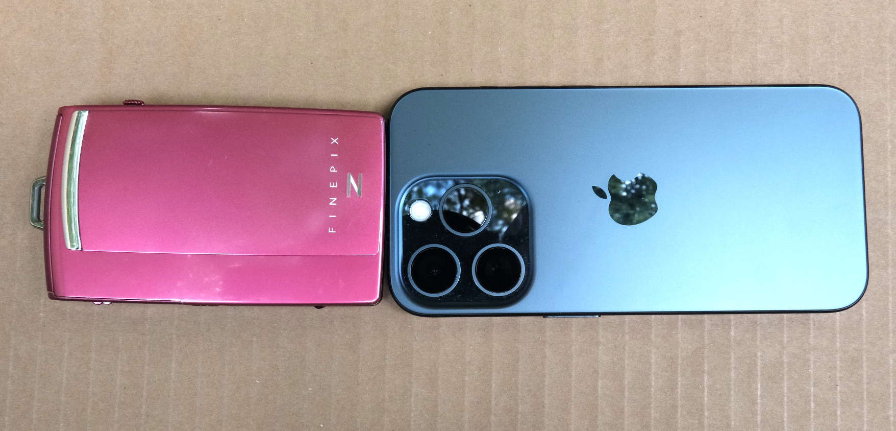 Fujifilm z1000 (left) and iPhone 15 Pro (right). Today a standard sized iPhone can be bigger than a dedicated camera.
