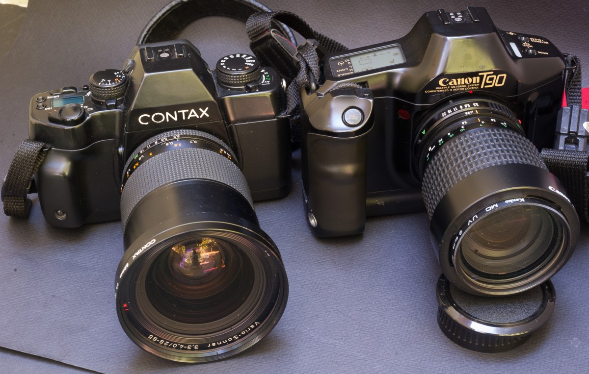 On the right the Canon T90 from 1986 – like the Contax, a very elaborate manual focus camera. The User Interface is totally different, though.
