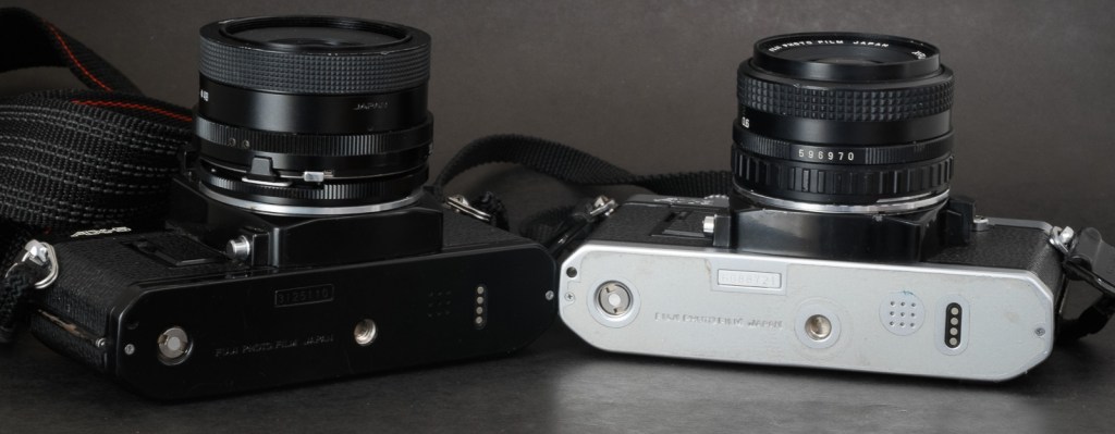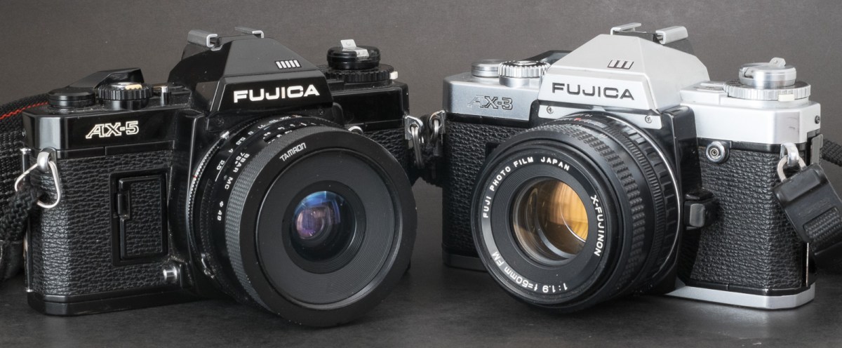 Fujica AX-5 (left) and AX-3 (right). The bodies were identical – the AX-5 just had more auto-exposure modes.