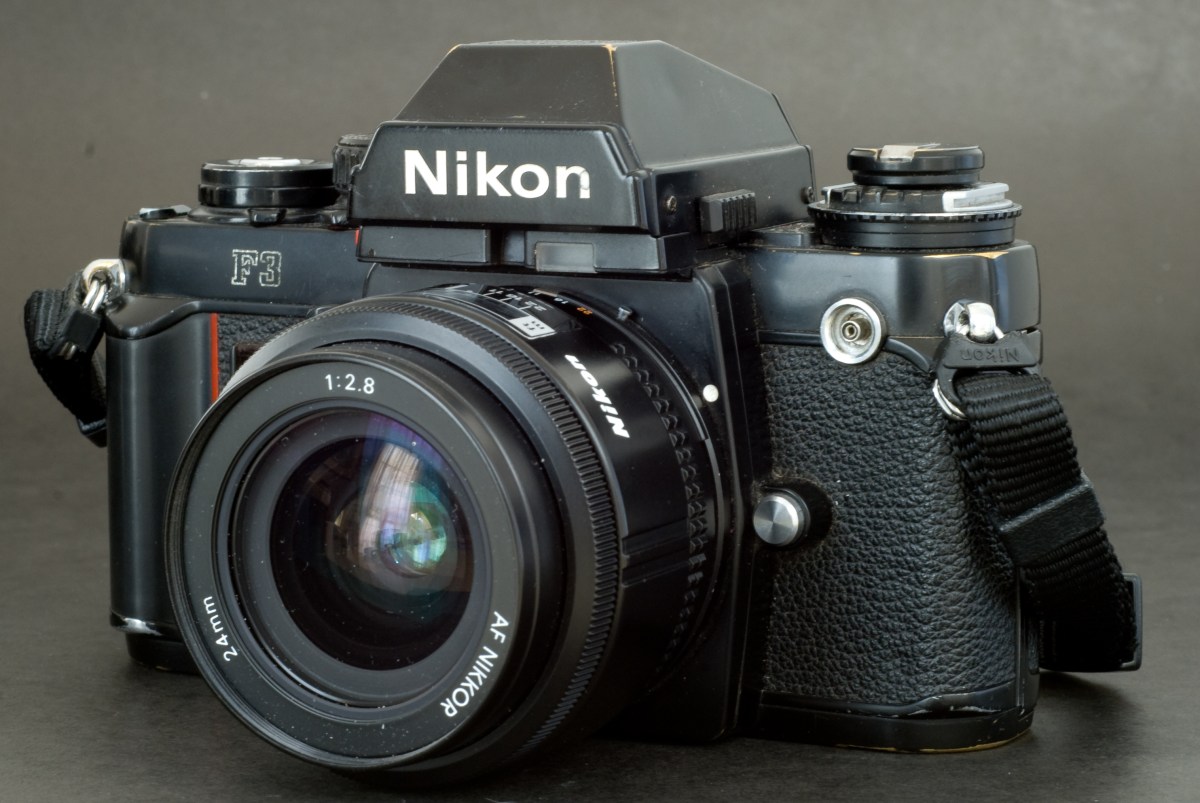 Nikon’s F3 was the “pro” camera of the early eighties, but it kept on selling until 2001. A dwarf compared to current mid-level digital SLRs, not to mention monsters like an EOS 1DS or a D3. Incredibly simple to use compared to anything digital sold these days. Aperture Priority Automatic or Semi-Auto exposure. Center weighted metering. That’s all. It worked. And it still works today.