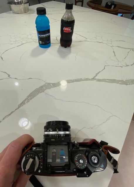 Cameras like this Nikon F3 have a removable prism. With the prism removed, one can see the image as formed on the ground glass (the focusing screen). At this stage, it is still inverted right/left you have to keep the camera at waist level to see the image of the subject.